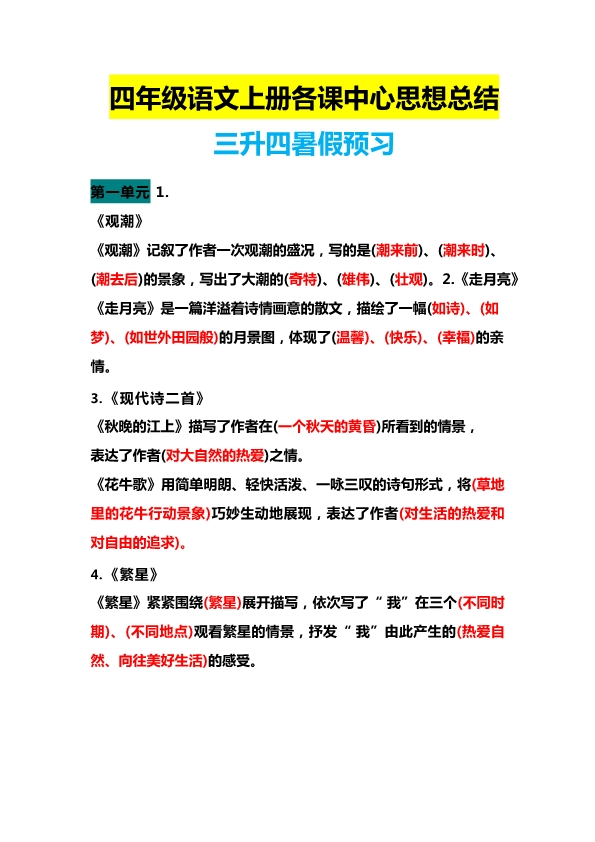 四年级语文上册各课中心思想期末总结是一份对学习四年级语文上册非常有帮助的资料。它对教材中的每一篇课文进行了深入的分析和总结,概括出了各课的中心思想,帮助学生更好地理解和掌握课文内容。