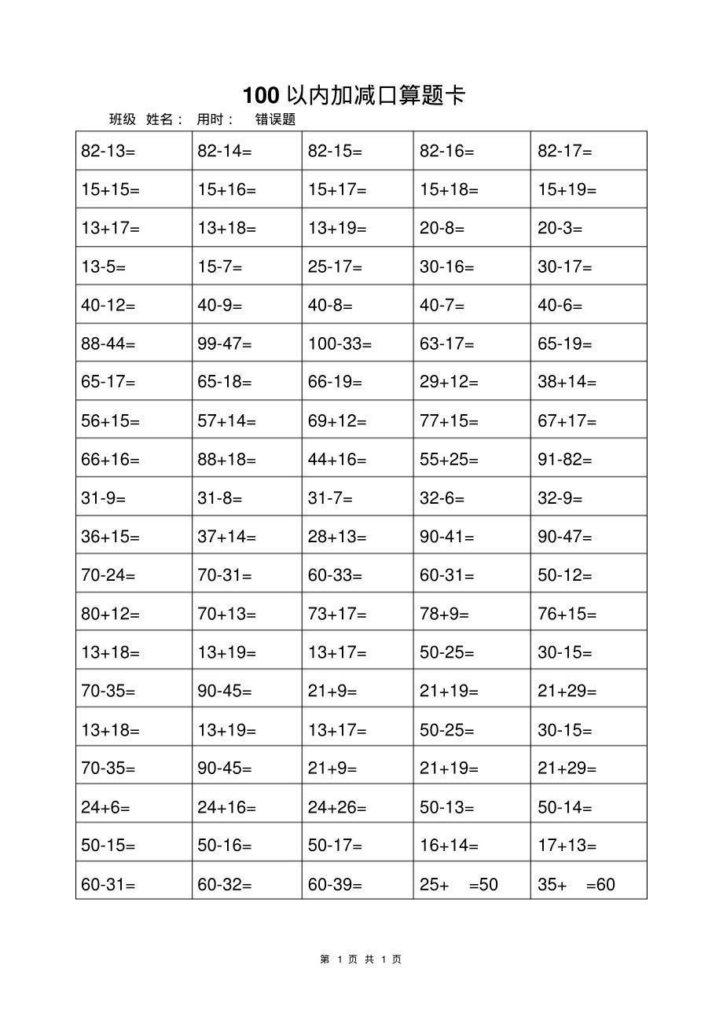 一年级上册数学100以内加减法打卡练习是一种针对一年级学生在学习数学时进行100以内加减法能力提升的专项练习。该练习旨在帮助学生掌握100以内加减法的基本计算方法和技巧,提高他们的运算能力和准确率。通过这种打卡练习,学生可以逐步巩固100以内加减法的计算基础,掌握快速、准确的计算方法,为以后的数学学习和实际应用打下坚实的基础。