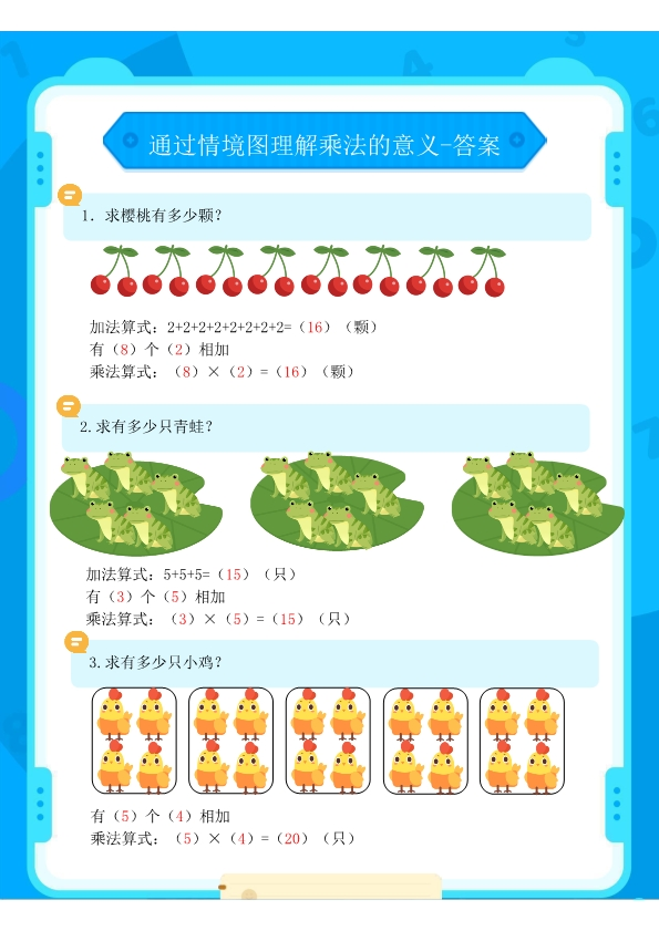 “二年级数学乘法练习:通过情境图理解乘法的意义合集”是一本旨在帮助二年级学生深入理解乘法概念的练习册。通过生动有趣的情境图,该练习册引导学生逐步掌握乘法的本质,使抽象的数学知识变得更加形象化和易于理解。每一个情境图都配合有相应的实际问题,让学生在解决问题的过程中感受乘法的实际运用,从而增强对乘法意义的理解。此外,该合集还提供了丰富的乘法练习题,旨在帮助学生通过大量实践进一步提高乘法运算的准确性和效率。