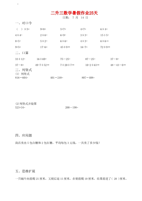 “二升三数学暑假作业25天 天天练”是一本为即将升入三年级的学生设计的数学暑假作业集。这本书按照25天的进度,每天提供一份数学作业,旨在帮助学生巩固和提升数学的核心知识点。