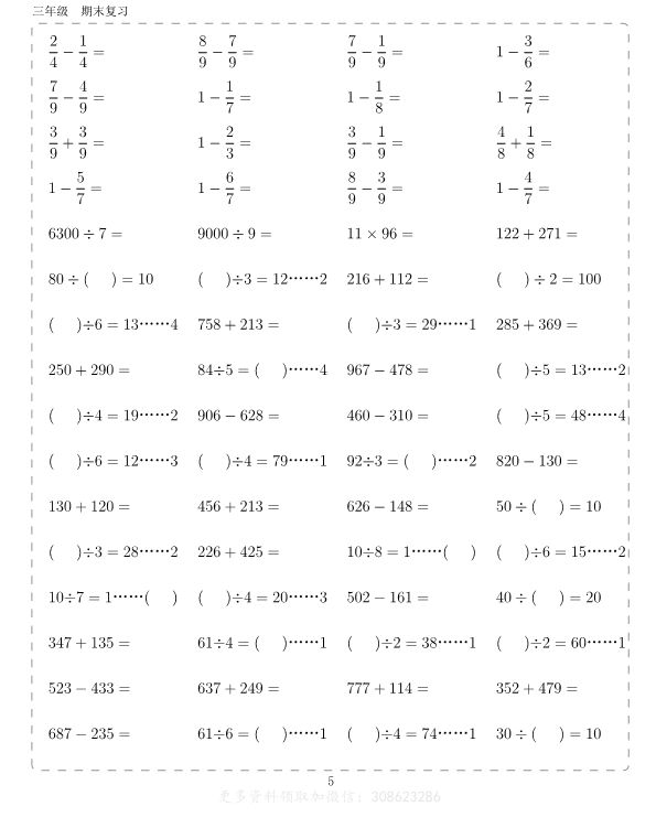 这份复习资料涵盖了三年级数学的各种计算题型,包括加减乘除、分数、小数、余数等。每道题目都配有详细的答案解析,方便学生自我检查和巩固提高。通过大量的计算练习,学生可以加深对数学计算规则的理解,提高计算速度和准确率。