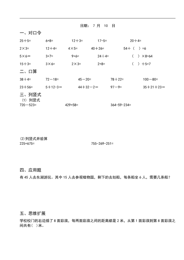 “小学二升三年级暑假数学作业”是专为即将从二年级升入三年级的学生设计的一套暑期数学学习资料。这份作业旨在帮助学生巩固和提升他们在二年级所学的数学知识,为即将到来的三年级数学课程做好准备。作业内容涵盖了加减乘除、分数、几何图形等多个数学主题,既有基础题目以复习知识点,也有一定难度的挑战题以提升思维能力。此外,作业还配有详细的解答,方便学生自我检查和家长辅导。