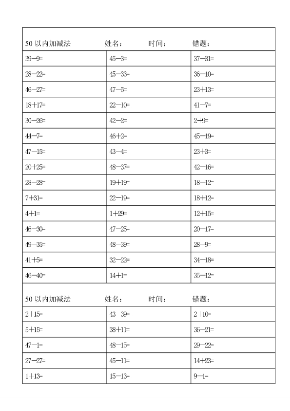 本套“一年级数学上册50以内加减法练习题”是专为一年级学生编写的数学学习资料,旨在帮助他们巩固和提高50以内的加减法运算能力。这套练习题涵盖了加法和减法的基本概念、运算规则以及实际应用,内容丰富、形式多样,包括填空题、选择题、计算题等。通过不断地练习和思考,学生们将能够熟练掌握50以内的加减法运算技巧,为今后学习更高级的数学知识打下坚实的基础。同时,这套练习题还注重培养学生的逻辑思维能力和解决问题的能力,使他们在学习过程中充分体验到数学的乐趣和魅力。
