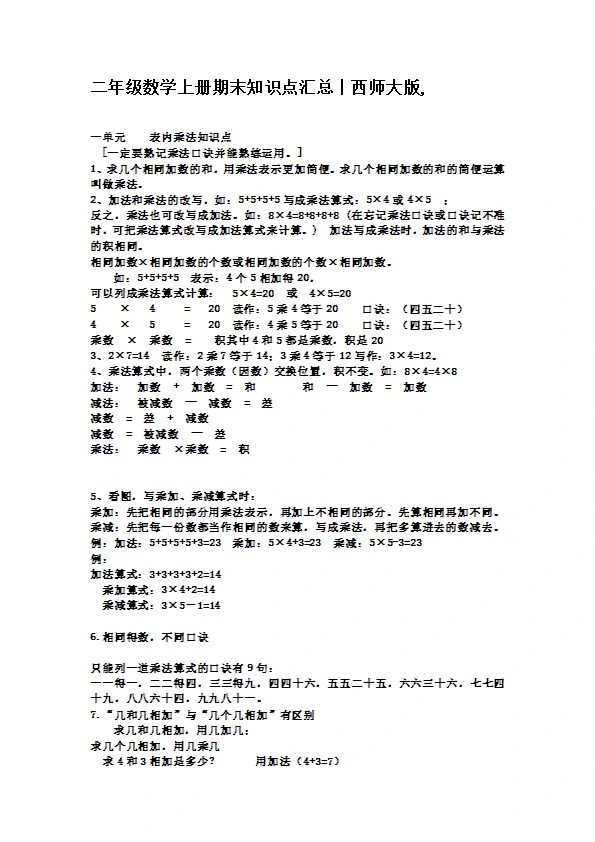 西师版二年级数学上册期末知识点汇总,包括表内乘法、角的初步认识、长度单位、观察物体和100以内的笔算加法和减法等知识点。其中,表内乘法部分介绍了乘法口诀和乘法算式的读写方法,角的初步认识部分介绍了角的定义、画法和直角、锐角、钝角的比较方法,长度单位部分介绍了统一标准测量物体的长度,观察物体部分介绍了从不同方向观察物体看到的形状,100以内的笔算加法和减法部分介绍了竖式计算的方法和平均分、除法算式的读法等知识点。最后,还提供了一些经典例题和练习题帮助理解和巩固知识点。